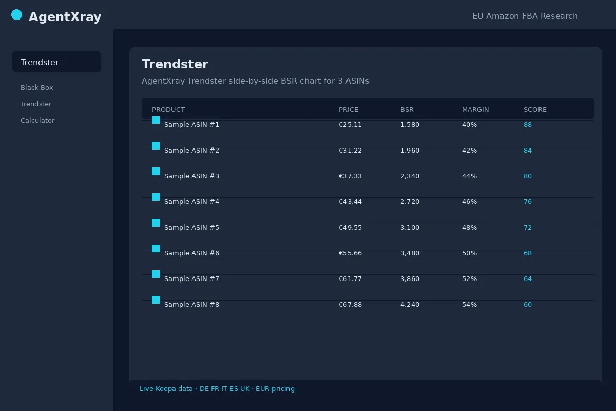- Helium 10's Trendster is a Google-Trends-style keyword-popularity chart bundled into Platinum. AgentXray's Trendster is product-level (ASIN BSR + price history), built EU-first, and standalone-priced from €9/mo. They answer different questions.